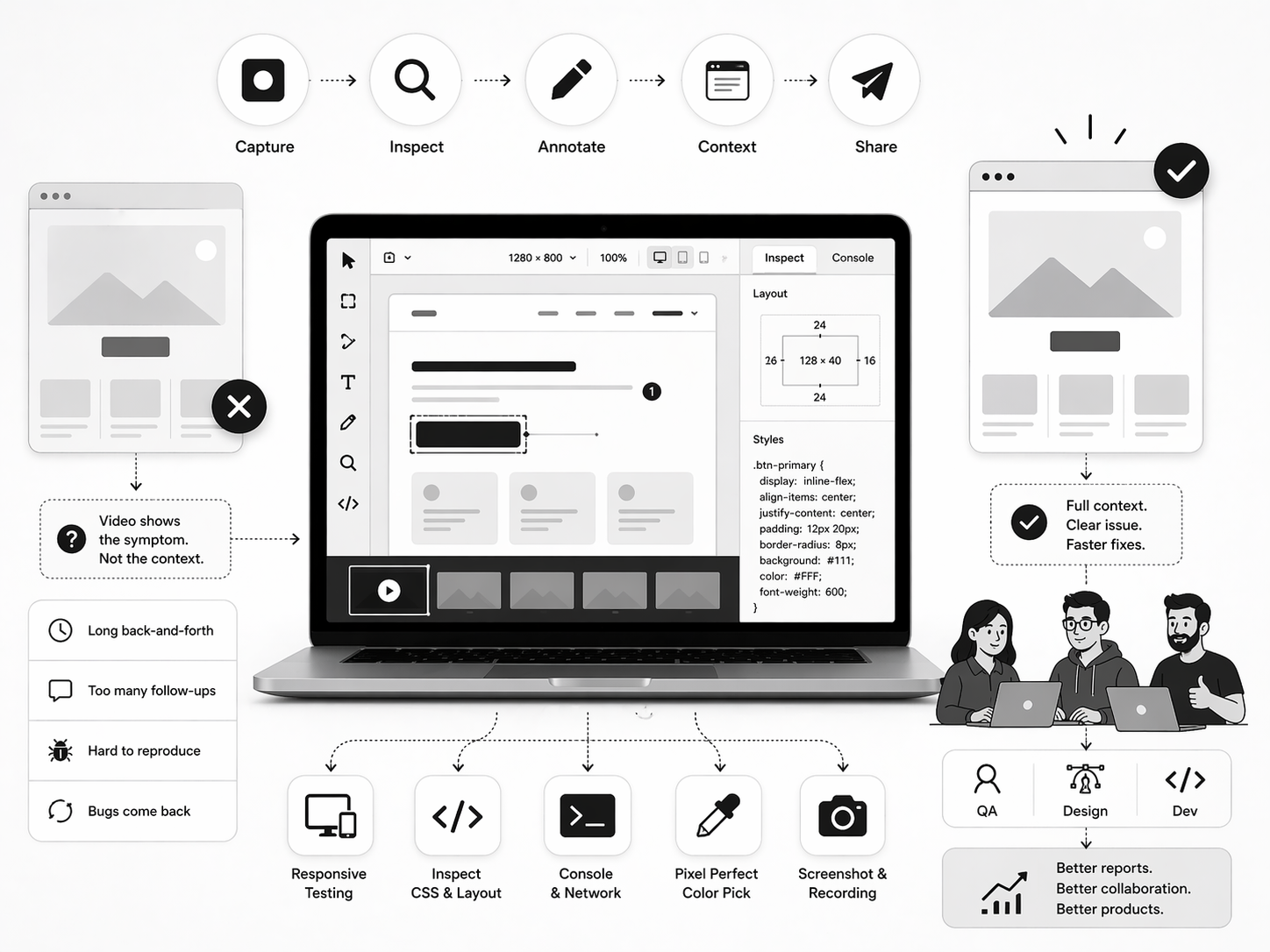Effective bug reports need more than motion on a screen. They require layout state, environment details, browser behavior, and enough precision to turn "I can't reproduce this" into a fix that can be shipped.