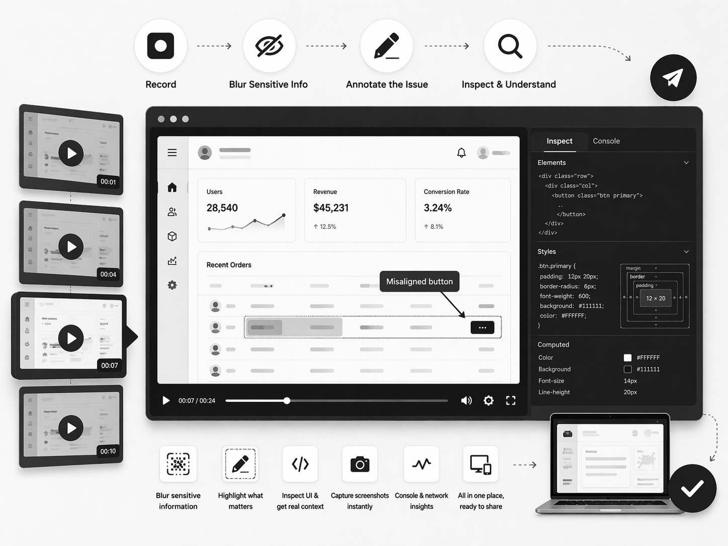 A screen recording is useful, but it is not always enough. Sometimes a bug needs more than playback. It needs context, clarity, and the ability to hide sensitive information before sharing it.